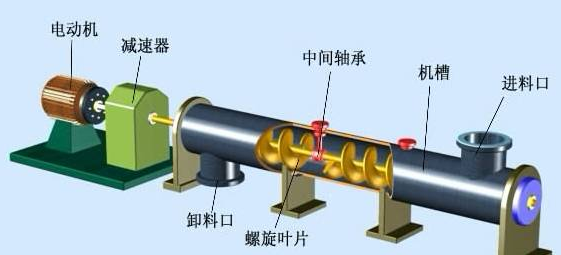 螺旋輸送機的發(fā)展經(jīng)歷了有軸螺旋輸送機和無(wú)軸螺旋輸送機兩種型式的演變過(guò)程。有軸螺旋輸送機由螺桿、U型料槽、蓋板、進(jìn)、出料口和驅動(dòng)裝置組成,而無(wú)軸螺旋輸送機則采用螺桿改為無(wú)軸螺旋,并在U型槽內裝置有可換襯體,結構簡(jiǎn)單,物料由進(jìn)料口輸入經(jīng)螺旋推動(dòng)后由出料口輸出,整個(gè)傳輸過(guò)程可在一個(gè)密封的槽中進(jìn)行。