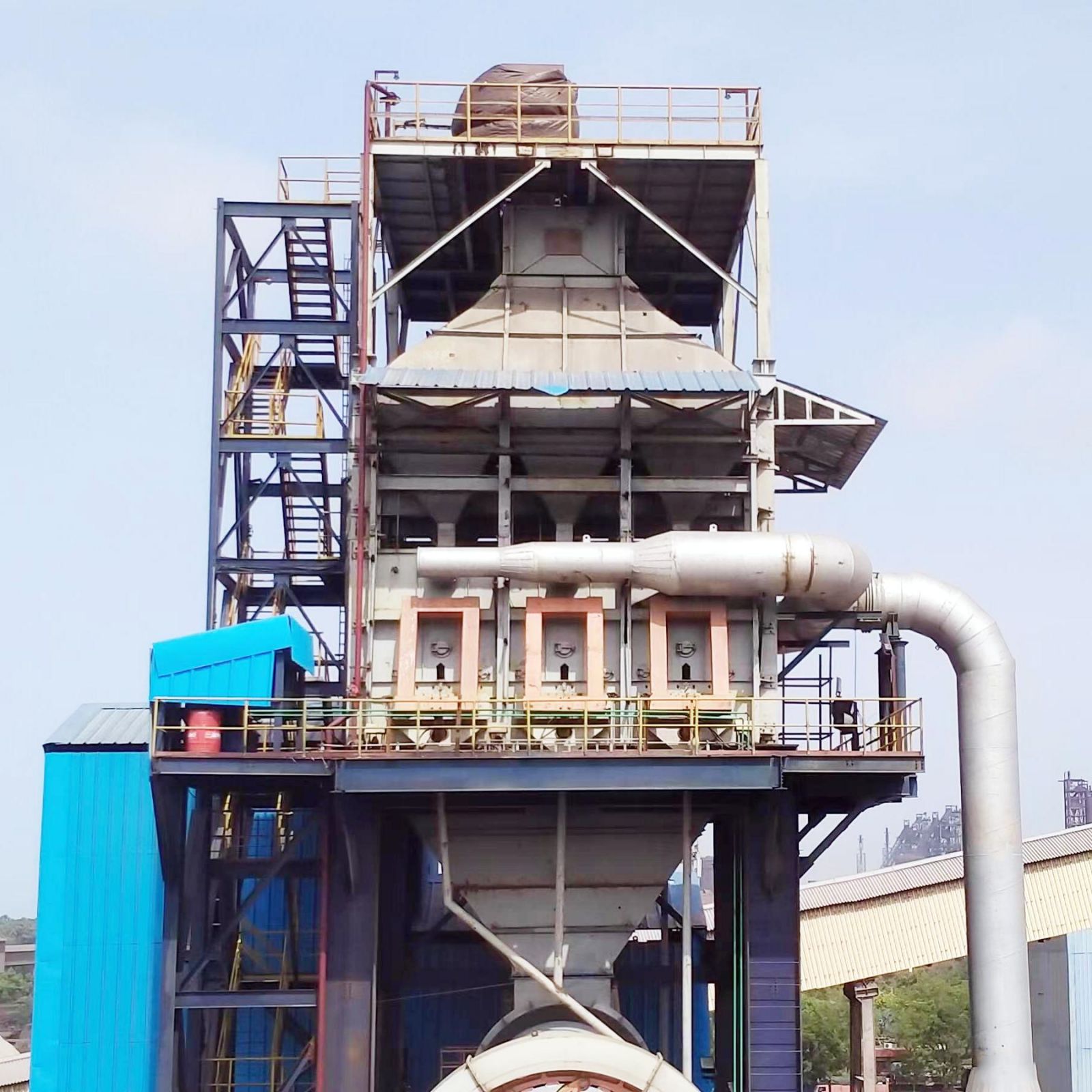 豎式預熱器和豎式冷卻機為河南鄭礦機器專(zhuān)利技術(shù)產(chǎn)品,具有入窯物料預熱效率高和出窯石灰冷卻效率高等特點(diǎn),產(chǎn)品單耗底、節能,節省場(chǎng)地面積。石灰活性高,白度好,均勻穩定。窯尾出預熱器廢氣采用機力空冷機,大幅降低入收塵器廢氣溫度,同時(shí)布袋收塵器入口加裝冷風(fēng)口,做應急使用,防止異常情況下高溫氣體燒壞收塵濾袋。